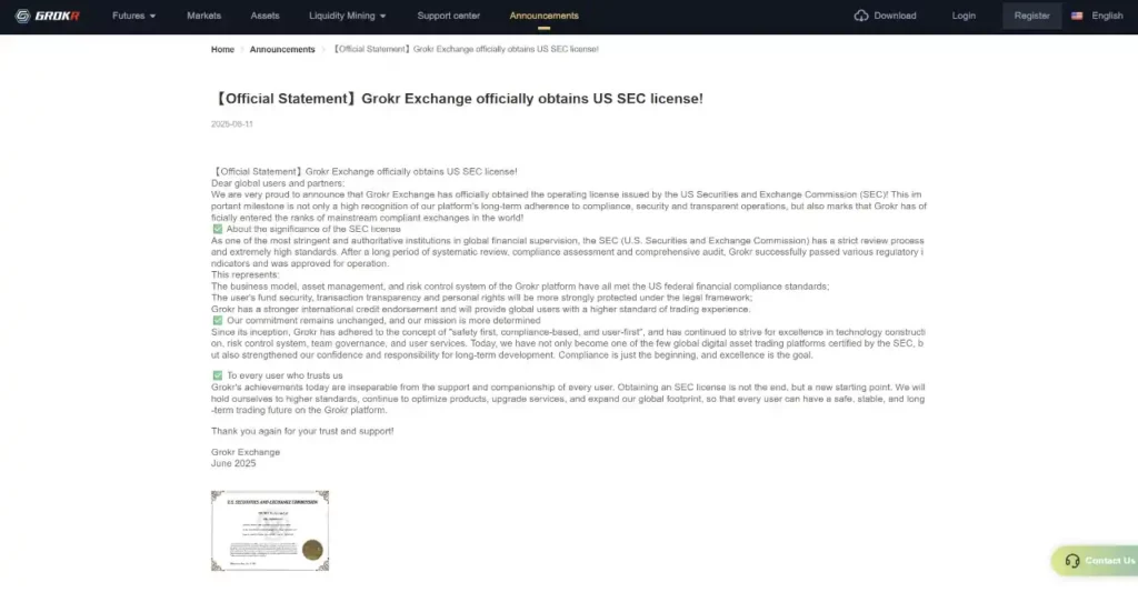 Hinzu kommt ein besonders dreister Täuschungsversuch: Auf einer Unterseite wirbt grokr-lssc.com mit einer angeblichen Lizenz der US-amerikanischen Börsenaufsicht SEC. Bei näherer Betrachtung entpuppt sich dieses Dokument jedoch als plumpe Fälschung. Die Angaben sind widersprüchlich, offizielle Registrierungsnummern existieren nicht und die SEC selbst führt die Plattform in keiner ihrer Datenbanken. Solche gefälschten Lizenzen dienen einzig dazu, Anlegern ein Gefühl von Sicherheit zu vermitteln und Vertrauen vorzutäuschen, wo keines gerechtfertigt ist.